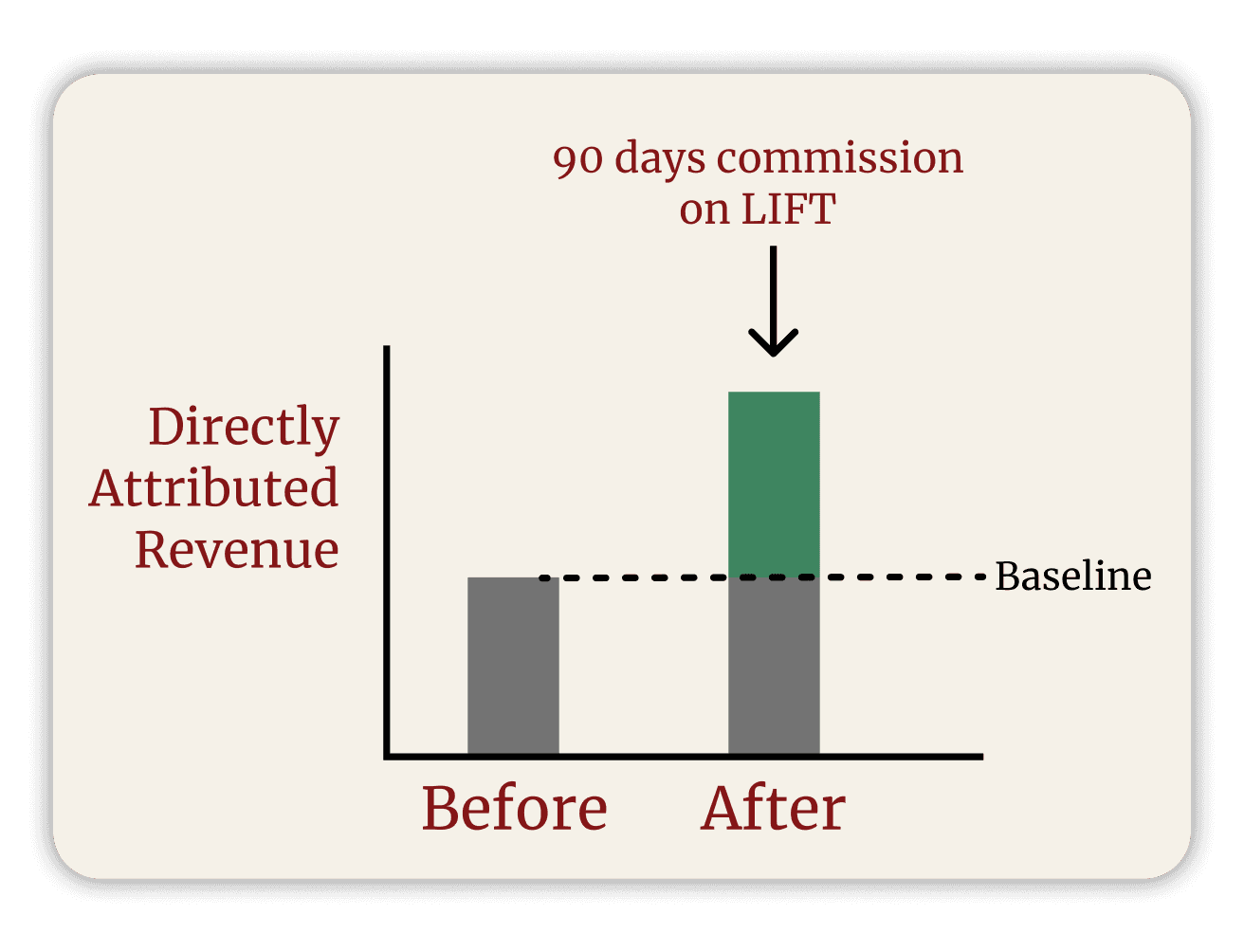 For 90 days, you pay a commission only on flow revenue above your baseline. Not on your total revenue. Not on your baseline. Only on what we add.