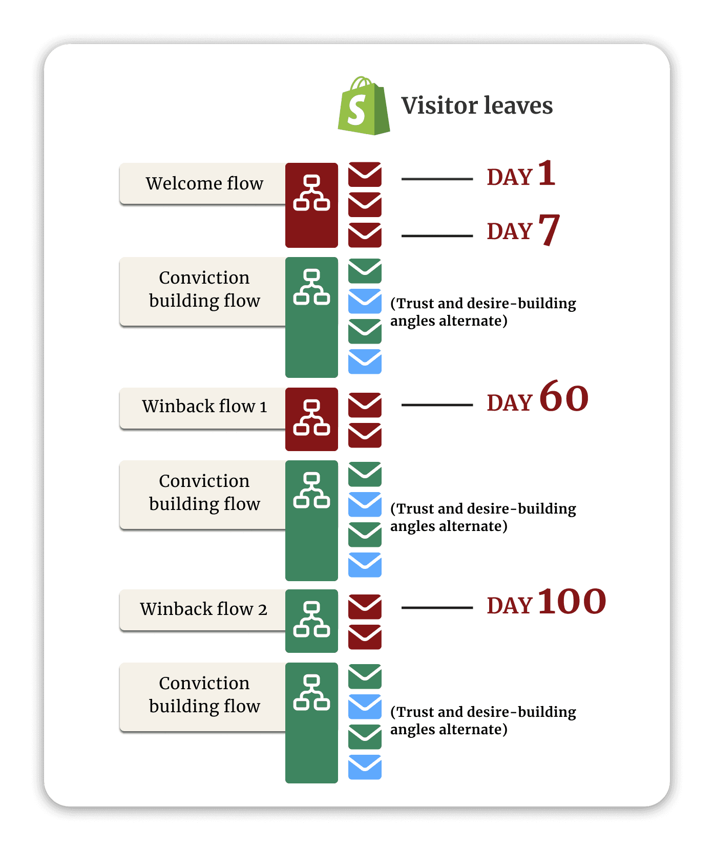 Days 7-60: Conviction-building emails: alternating between trust angles and desire angles, one email at a time. 1-2 times per week automatically, for months.